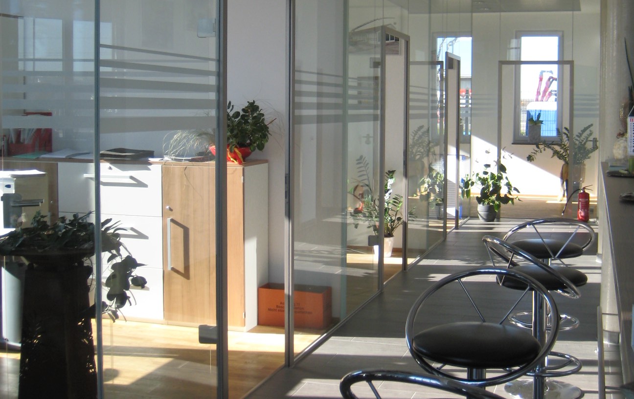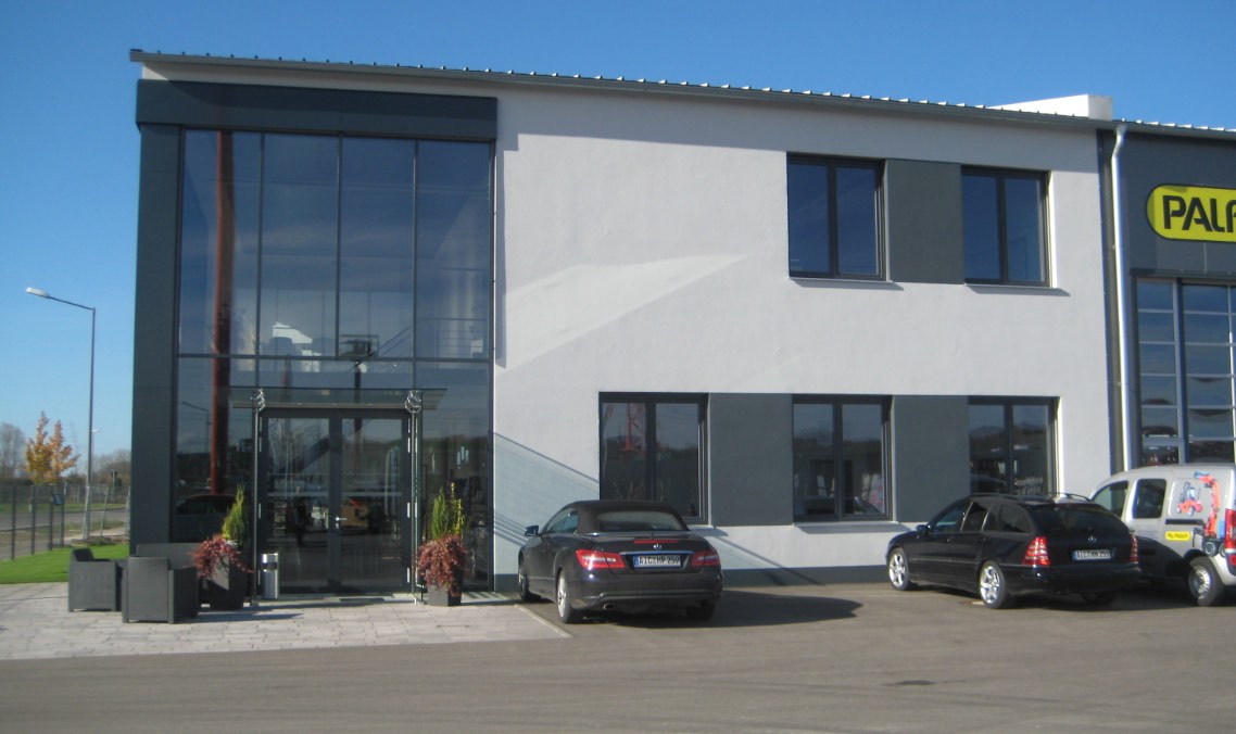 Gewerbeobjekt auf schwierigem Baugrund mit Bodenaustausch. Bürotrakt in Massivbauweise. Gewerbehalle in Fertigteilbauweise. Umhüllung mit Sandwich-Platten. Heizung über Bauteilaktivierung der Bodenplatte. In der Halle mehrere Montagegruben und Montagekran.