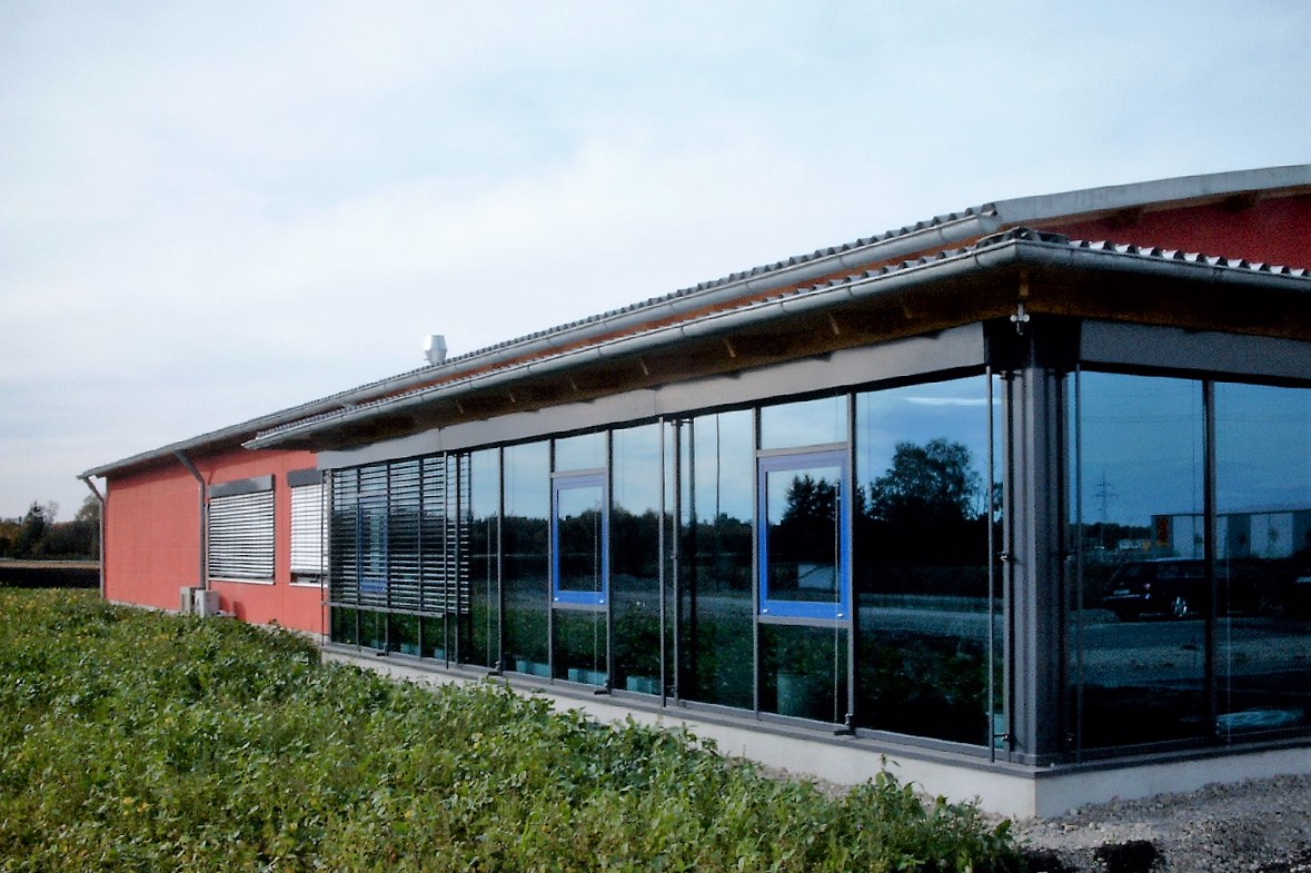 Stahlbetonskelettbau mit Porenbeton, Umfassungswände. Segmentbogendach mit bombierter Wellblechabdeckung. Bürobereich nach Osten und Süden in Vollverglasung. Gesamtes Objekt in den corporate-identity-Farben des Betriebes. Dachtragwerk aus Leimholzbindern (sichtbar). Zwischenwände im Gebäude sichtbar gefaste Kalksteinwände. Im Objekt Bodenheizung. Außenbereich mit Stellplätzen. Vorgarten als japanischer Garten angelegt.